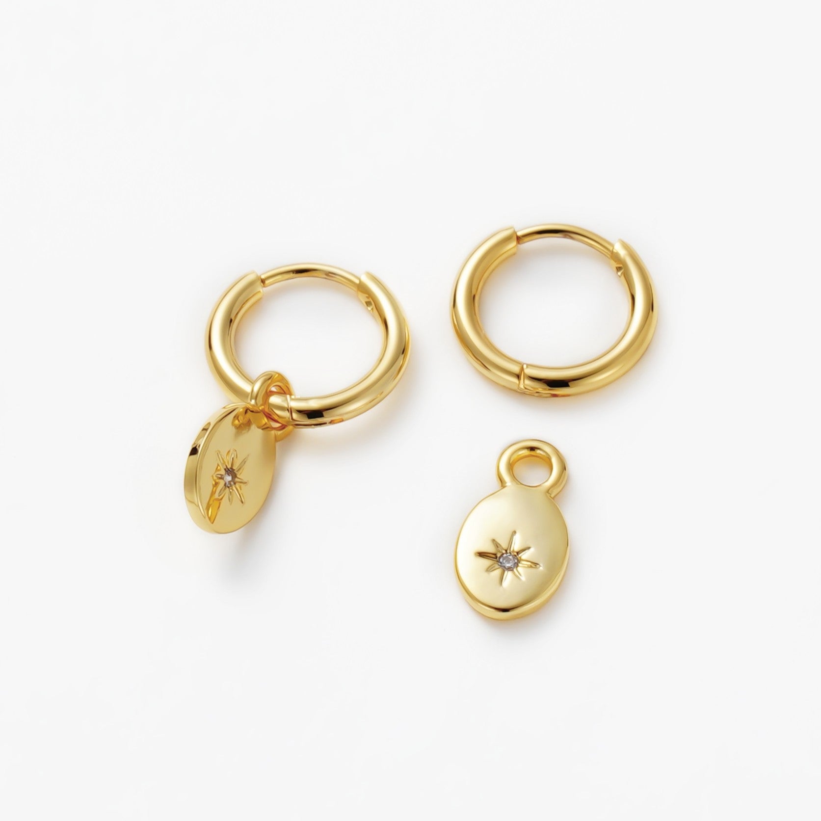 Meet the Nala Huggie — a timeless piece designed for effortless versatility. Crafted from a solid brass base and finished in high-polish silver, this refined hoop features a delicate oval charm engraved with a subtle starburst and set with a single sparkling crystal. The charm can be removed, allowing you to wear the Nala as a classic, minimalist hoop or with the drop for a touch of celestial detail. Elegant yet understated, it’s the perfect piece to take you from everyday wear to evening style with ease.