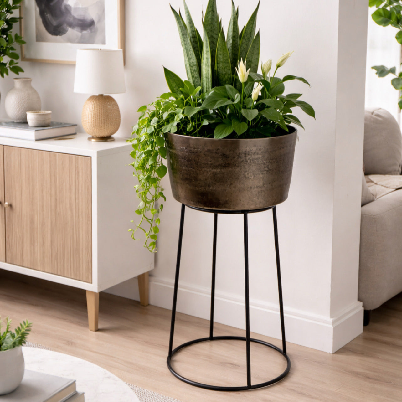 Standing wine bucket with black iron base and dark silver bucket which can be removed for easy use. Perfect for entertaining this bucket can hold up to 4 wine bottles.