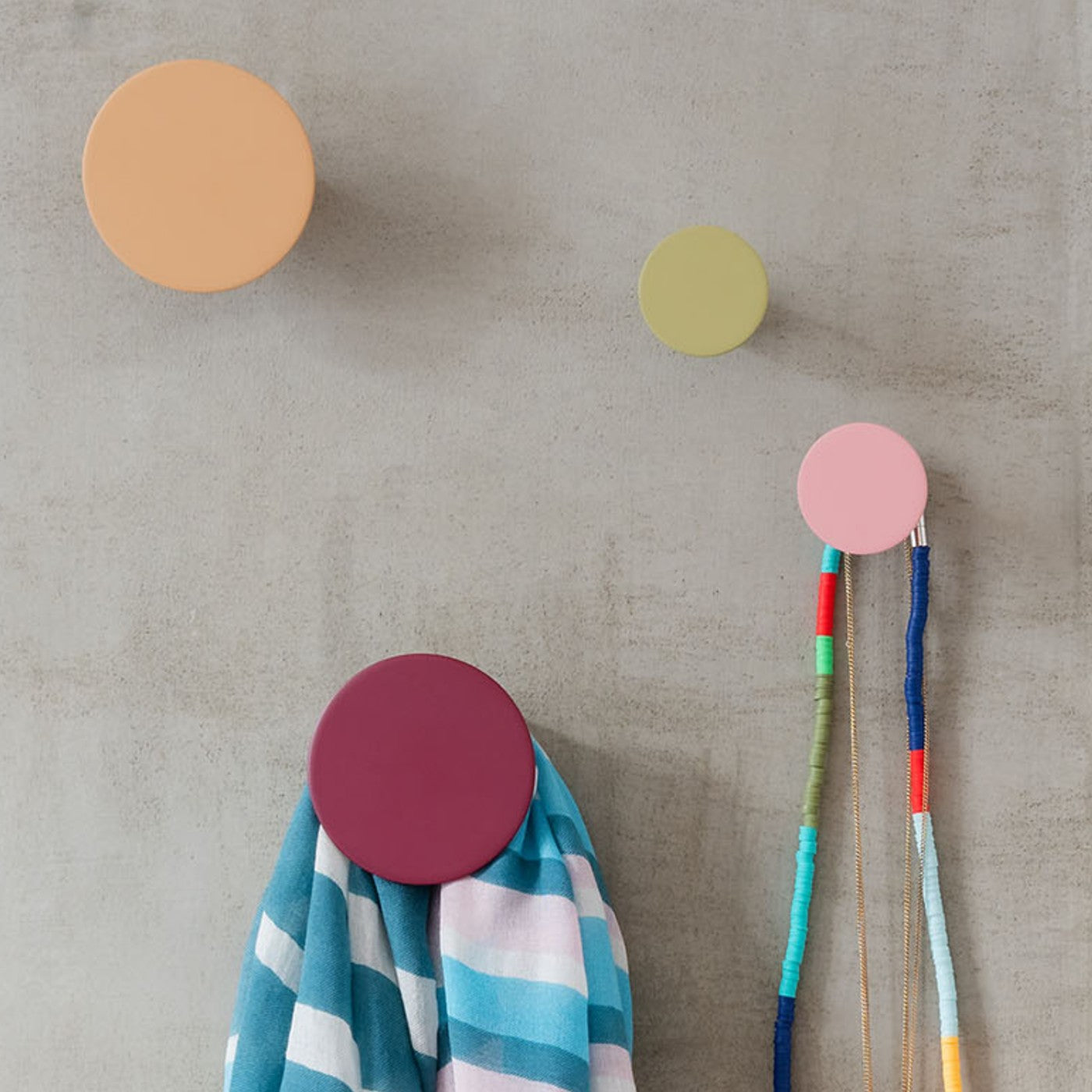 The colorful set of 4 includes two large and two small wall hooks and comes with M4 screws (dowels not included). Made of polyresin, the hooks are available in two different sizes: 2 pieces with a diameter of 4.7 cm each and 2 pieces with a diameter of 8.3 cm each.